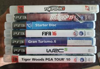 Lotto composto da 5 videogiochi per PlayStation 3, più uno Starter Disc. - Top Spin 3 - MotoGP 15 - Starter Disc - FIFA 16 - Gran Turismo 6 - WRC 5 - Tiger Woods PGA TOUR 10