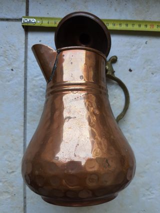 Elegante brocca realizzata interamente in rame con dettagli in ottone. - Materiale: Rame e ottone - Design martellato Ancora in ottime condizioni (unico problema è il coperchio che va risaldato, vedi foto). Le dimensioni sono 17x 22 circa Spese spedizione escluse