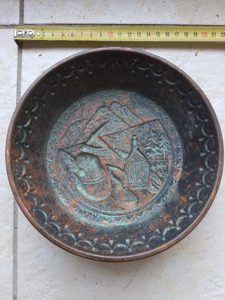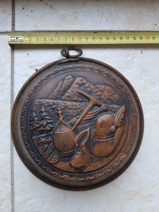 Antico stampo realizzato interamente in rame. - Materiale: Rame - Design: Montagne, piccone, scarponi, albero e fiasco Oggetto antico, ancora in ottime condizioni. Completo del suo anello per poterlo appendere. Spese spedizione escluse