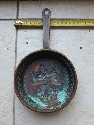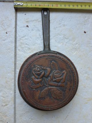 Antico stampo in rame con decoro di rose. - Materiale: Rame Antico Stampo padellina in rame. Oggetto antico, ancora in ottime condizioni. Si può appendere - Motivo: Due rose con foglie - Bordo decorato Spese spedizione escluse