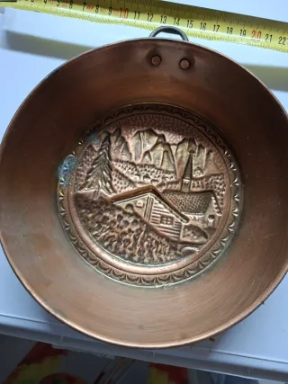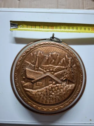 Bellissima formina in rame con un paesaggio montano inciso. Perfetta per decorare o per uso culinario. Spese spedizione escluse - Materiale: Rame - Design: Paesaggio alpino con casa e alberi - Forma: Rotonda - Dettagli: Anello per appenderla