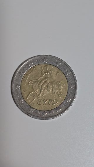 2 Euro Grecia 2002 Europa rapita da Giove Scena di un mosaico di Sparta del III secolo d.C., raffigurante Europa rapita da Giove, che ha assunto le sembianze di un toro; Europa è la figura mitologica greca che ha dato il nome al continente