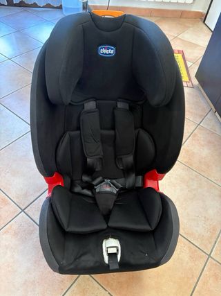 Seggiolone auto Chicco di colore nero, ideale per il trasporto sicuro dei bambini. - Logo Chicco visibile sul poggiatesta. - Cintura di sicurezza a 5 punti. - Seduta imbottita per un maggiore comfort. - Struttura di base rossa.
