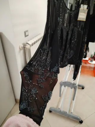 Elegante maglia da donna con dettagli ricamati e perline. La maglia presenta un design raffinato e sofisticato. - Tessuto trasparente con decorazioni. - Maniche lunghe. - Orlo e polsini decorati.