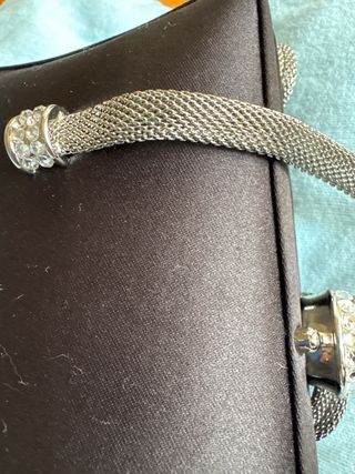 Splendida borsetta da sera, perfetta per completare un look elegante. - Materiale in raso nero. - Dettagli metallici color argento. - Chiusura a scatto con strass e pietra fucsia. - Catena a maglie metalliche argentate.