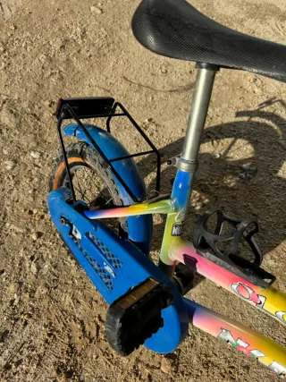 Bicicletta con telaio colorato e design unico. - Telaio con sfumature arcobaleno e dettagli. - Manopole blu. - Portaborraccia nero.