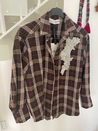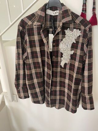 Camicia a quadri del brand HAVEONE. - Fantasia a quadri marrone e multicolor. - Dettaglio decorativo con strass sul petto. Nuova ancora con cartellino!