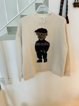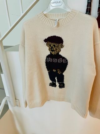 Maglione girocollo color panna con un simpatico orsetto stilizzato sul davanti. - Design con orsetto in maglia. - Collo, polsini e fondo a costine.