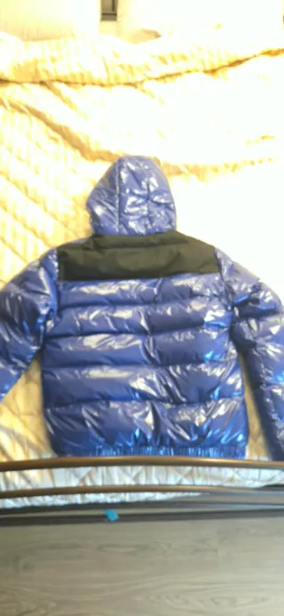 Piumino Armani con un design moderno e un interno vivace...imbottitura interna piuma...messo due volte...tg L... - Tessuto esterno lucido - Cappuccio foderato internamente con un colore a contrasto - Chiusura frontale con zip