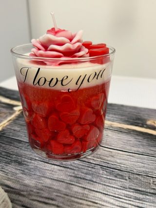 Candela artigianale perfetta per un regalo speciale. - Decorata con cuoricini rossi. - Finitura a forma di rosa in cima. - Scritta I love you sul vetro.