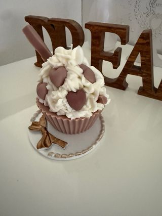 Deliziosa candela a forma di cupcake, perfetta per aggiungere un tocco di dolcezza alla tua casa. - Decorazione con glassa bianca e cuoricini. - Inserito un bastoncino decorativo. - Base con fiocco dorato.