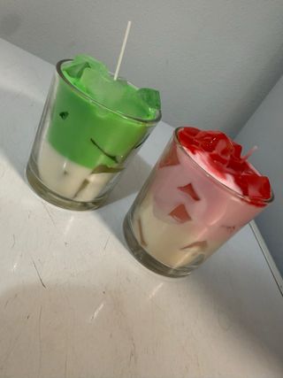 candele decorative in vetro, una verde e una rosa, con un design unico che ricorda dei cubetti di ghiaccio. Potete scegliere tra i due colori o chiederne una personalizzata in questo stile ( annuncio x una sola candela ) - Fatte a mano. - Profumate. - Ideali come elemento d'arredo.
