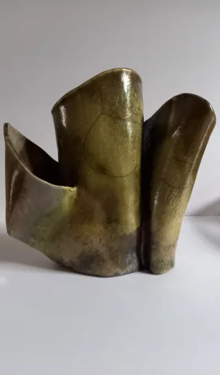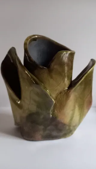 Particolare vaso vintage, dalla forma fluida e astratta, pezzo realizzato con la tecnica raku, dalle tonalità che vanno dal verde oliva al marrone, sul fondo del vaso è riporta la firma incisa a mano, Pupa ( Pupa Stanciu? Ceramista rumena nata nel 1944 ). È in perfette condizioni. Dimensione cm 12x18xH18,5 Peso gr 1013 P.S. NON SPEDISCO CON BRT - Design unico e originale. - Finitura lucida con sfumature verdi e marroni. - Firmato sul fondo