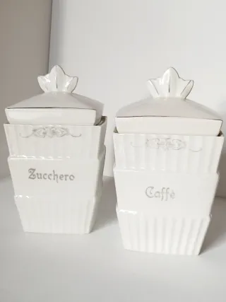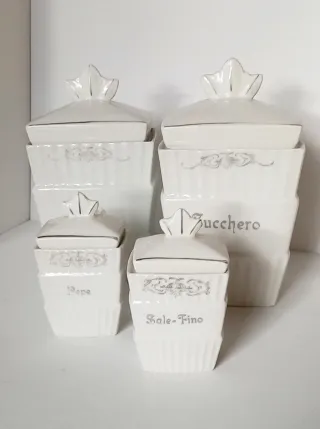 Elegante set di quattro contenitori in porcellana bianca con decori argento, Art Deco degli anni '30 ( erano della mia nonna ), manifattura tedesca Mitterteich Bavaria. Perfetti per conservare spezie o zucchero, in buone condizioni vista l'età, non presentano sbeccatura o crepe. Barattoli grandi cm 8x10,5xH19 Barattoli piccoli cm 6x4,3xH10 Peso totale gr 1409 P.S. NON SPEDISCO CON BRT - Set di 4 contenitori - Decorazioni in rilievo e scritte Zucchero-Caffè-Sale Fino- Pepe - Finitura con decoro argento