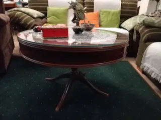 Tavolo rotondo in legno con copertura in cristallo