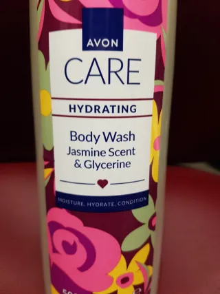 Bagnoschiuma Avon Care con profumo di gelsomino e glicerina. La confezione presenta una stampa floreale con fiori rosa e gialli. - Fragranza: Gelsomino - Ingredienti: Glicerina - Volume: 500 ml - Idrata, ammorbidisce e condiziona la pelle.