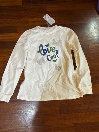 Completo per bambina composto da maglia a maniche lunghe e leggings. - Maglia bianca con stampa love cool e farfalle. - Leggings neri con stampa di farfalla iridescente sul fondo gamba. completamente nuovo, presenta ancora cartellino
