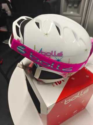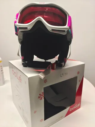 Casco da sci per bambina marca Bolle, taglia 49/53. - Design colorato con dettagli fucsia e turchesi. - Lenti a maschera rosse. - Imbottitura interna in tessuto grigio.