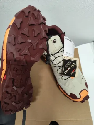 Scarponcini da trekking Salomon in ottime condizioni, perfetti per le tue avventure all'aria aperta. - Modello impermeabile con tecnologia Gore-Tex. - Design robusto e confortevole. - Colore beige e arancione con dettagli bordeaux.