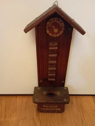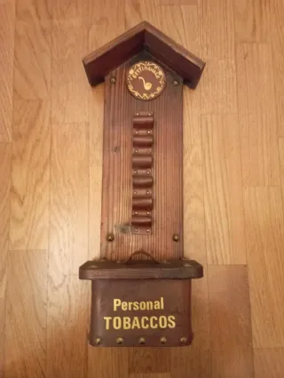 Elegante portapipe vintage, un pezzo unico per gli appassionati. - Struttura in legno scuro con dettagli dorati. - Supporti per pipe in cuoio. - Decorazione circolare con simbolo di pipa. - Vano inferiore Personal Tobaccos.Bellissima patina ,con normali segni del tempo Altezza 42 cm