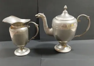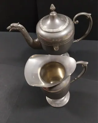 Set composto da una teiera e una lattiera in peltro finemente lavorato, marcato Delfi - Zinn Etain Veritable Pewter Peltro 95% in Ottime condizioni.( anni 70) È presente una piccola ammaccatura sul bordo della Teiera che non compromette la bellezza della stessa Altezza Teiera 19 cm Altezza Lattiera 15,5 cm Peso totale di entrambe 940 g - Materiale: Peltro 95% - Design unico a forma di animale per la teiera.