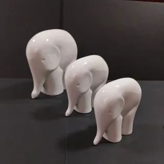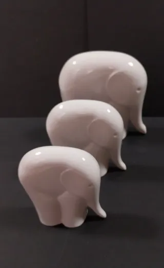 Set di tre elefanti decorativi in ceramica bianca, perfetti per aggiungere un tocco di eleganza alla tua casa. L'elefante più piccolo sul lato superiore ha una piccola crepa visibile in foto, per il resto le condizioni sono ottime. - Realizzati in ceramica lucida. - Design stilizzato e moderno. - Tre dimensioni diverse per un effetto visivo dinamico.