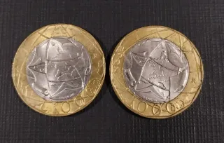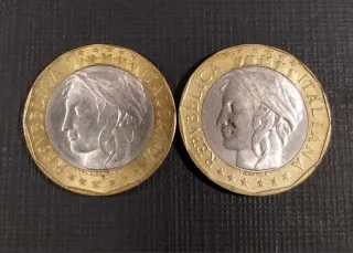 N°2 Monete da 1000 Lire italiane del 1997 una con Mappa Europa sbagliata e una con Mappa giusta. - Dritto: Mappa d'Europa con un errore. - Rovescio: Valore nominale e anno di coniazione.