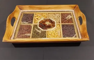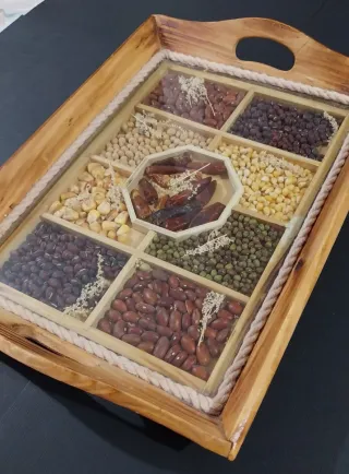 Elegante vassoio in legno, perfetto per presentare diversi ingredienti. - Struttura in legno con finitura naturale. - Divisori interni per separare i contenuti. - Copertura trasparente per proteggere gli alimenti.