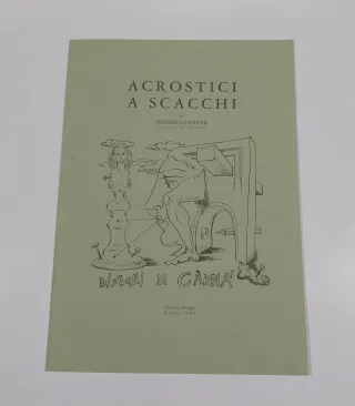 ACROSTICI A SCACCHI - di Federico Hoefer con disegni di Carná Questa raccolta di poesie del poeta Federico Hoefer (1930-2018) è stata fatta in collaborazione con il pittore, scultore, disegnatore e poeta Marco Carná (1929-2021) e impreziosita da un Disegno originale dello stesso, un esemplare di soli 30 disegni riservati ad amici e collaboratori.....un foglio fuori commercio. Anno di pubblicazione 1994 Pubblicazione x Collezzionisti d'arte contemporanea unica.