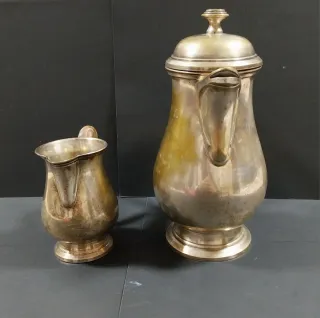 Set composto da caffettiera e lattiera in stile primo Novecento. Solida Caffettiera più Lattiera del primo novecento in Lega d' Argento (Metallo Argentato /Alpacca) con manici in Legno lavorato in condizioni Ottime (come da foto) Dimensioni Caffettiera: 21,5 x 17,5 x 11 cm (Peso 800 g) Sono presenti patine e macchioline diverse dovute al segno del tempo. Dimensioni Lattiera: 10,5 x 12 x 7 cm (Peso 200 g) - Materiale: metallo argentato. - Manici in legno. - Design d'epoca.