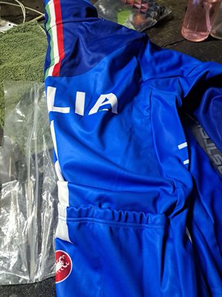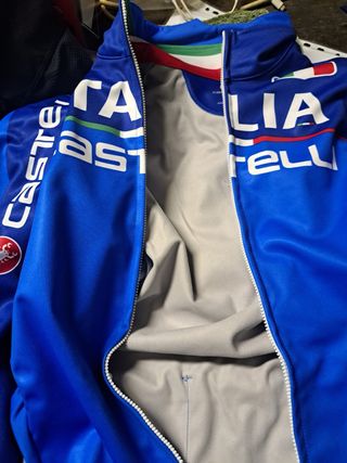 Giacca Castelli Italia, perfetta per proteggersi da freddo e vento - Colore blu vivace. - Logo Castelli sul petto. - Dettagli tricolore sulla parte superiore. - Taglia M