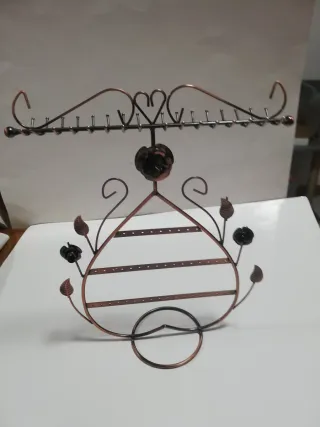 Elegante portagioie in metallo, perfetto per organizzare i tuoi gioielli. - Design con rose e foglie. - Struttura a più livelli per orecchini e collane. - Base circolare per maggiore stabilità.