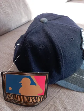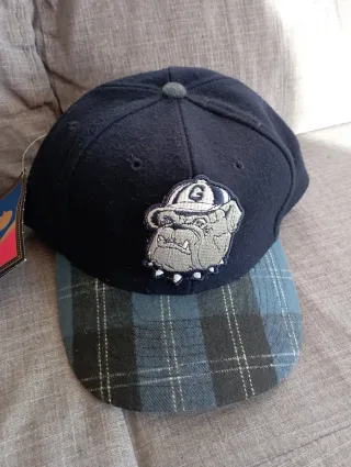 Cappellino da baseball con logo Georgetown Hoyas. - Patch ricamato con bulldog e lettera G. - Visiera a quadri blu e grigi. Nuovo con cartellino del 125esimo