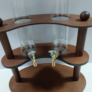 Elegante dispenser doppio per vino e liquori, perfetto per ogni occasione. Dispenser x Vino/Grappa/Liquori in ottime condizioni, senza perdite in vetro con supporto in legno con rubinetti in ottone Dimensioni di ingombro: 39x24x84 cm Origine Italia Per la spedizione l'oggetto verrà smontato e imballato a dovere La tenuta dei rubinetti è stata testata Le foto sono parte integrante della descrizione - Struttura in legno scuro - Rubinetti dorati per dosare le bevande.