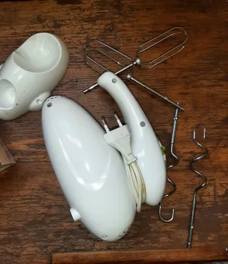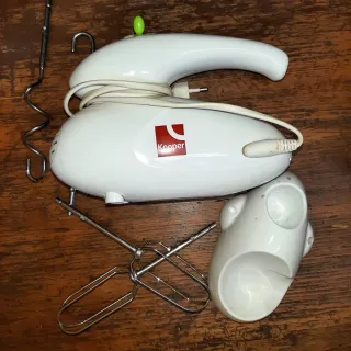 Sbattitore elettrico bianco della marca Kooper,completo di supporto. - Design compatto e maneggevole. - Include fruste in metallo per montare e impastare. - Supporto in plastica bianca per riporlo comodamente. - Usato nella seconda casa pochissimo.