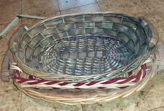 Set di tre cesti natalizi, perfetti per decorare o per contenere regali. - Cesto ovale in vimini grigio/blu stinto con manici in legno. - Cesto rettangolare con bordi decorati in tessuto rosso e bianco e manici in legno. - Cesto ovale in vimini marrone con manici in legno. Prezzo per tutte.