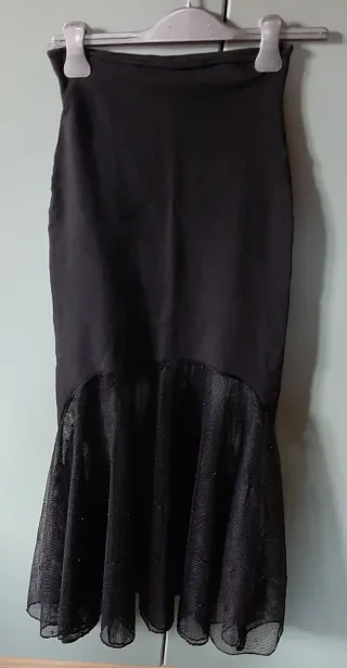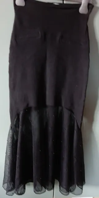 Gonna lunga con vita alta e un dettaglio di trasparenza sul fondo. - Tessuto leggero e fluente. - Inserti in tessuto trasparente con perline nere. - Design a sirena. - Bellissima, sexy e fasciante.