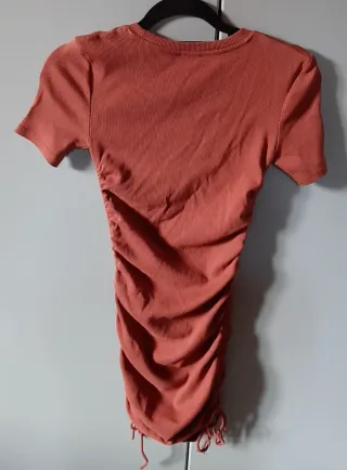 Vestito corto con dettagli arricciati sui fianchi e laccetti regolabili sul fondo. - Tessuto a costine. - Maniche corte. - Girocollo.