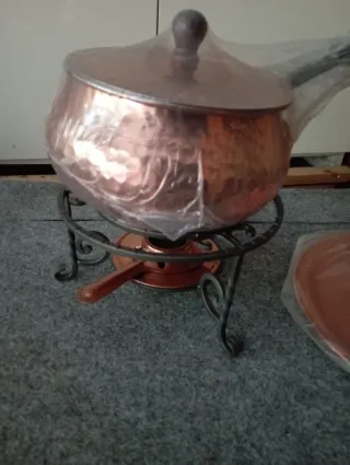 Lotto di oggetti vintage in rame, ideali per collezionisti o per chi ama lo stile retrò. - Pentola in rame con coperchio e manico. -Boccale in rame - trofeo di pesca -piccola lanterna -Scultura legno , tranne la pentola di rame che è nuova gli altri oggetti possono presentare segni normali del tempo