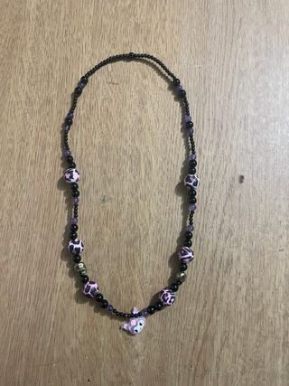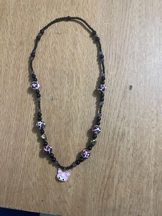 Collana fatta a mano con perle nere e viola, impreziosita da un simpatico ciondolo a forma di gatto. - Perle di pietra. - Ciondolo a forma di gatto. - Design unico.