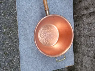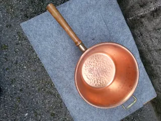 Un paiolo in rame dal fascino vintage, con un pratico manico in legno. - Materiale: Rame - Manico: Legno - Finitura interna martellata