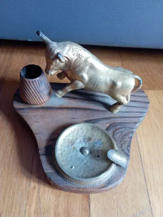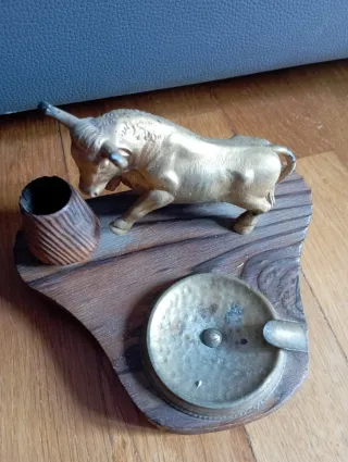 Bellissimo portacenere vintage con una statuetta di un toro in ottone dorato, montato su una base in legno. Un pezzo unico per gli amanti del genere. Con normali segni del tempo necessita piccoli ritocchi - Statuetta di toro in ottone dorato. - Base in legno con finitura venata. - Vaschetta portacenere in ottone.