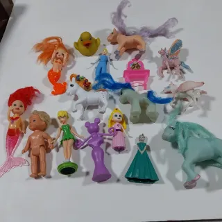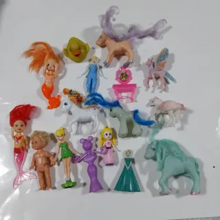 Lotto misto di 16 giocattoli per bambini, include bambole, cavalli e accessori in condizioni come da foto - Bambole sirena con capelli colorati. - Cavalli di varie dimensioni e colori. - Accessori come specchio e altri piccoli oggetti.