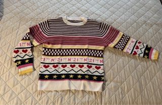 Maglione colorato con fantasia a righe, cuori e stelle. - Maniche lunghe. - Girocollo. - Design a fantasia.