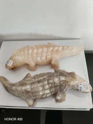 Bellissima scultura di coccodrillo realizzata interamente in onice naturale. Ogni pezzo è unico grazie alle venature naturali della pietra che simulano la pelle dell'animale. -Materiale: Onice autentico. -Lunghezza: Circa 20 cm (come indicato dal metro nelle foto). -Stato: Nuovo, fondo di magazzino da attività cessata. -Prezzo: Vendo sottocosto a 14€ (prezzo negozio 35€) un pezzo due pezzi €25