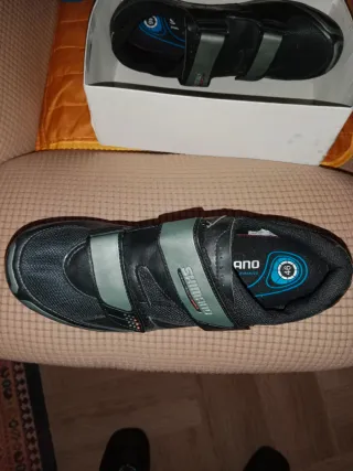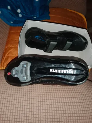 Scarpe da ciclismo Shimano. - Taglia 46. - Chiusura a velcro. - Suola con attacchi per pedali. - Logo Shimano sulla suola.