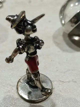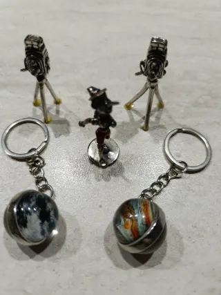 Set di 5 pezzi Cimelli vintage, composto da due cineprese in miniatura su treppiede, una statuetta di un personaggio e due portachiavi con sfere decorative. - Due cineprese in miniatura. - Una statuetta. - Due portachiavi con sfere.