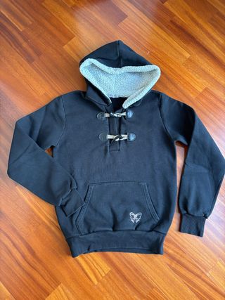 Felpa da donna con cappuccio e chiusura a alamari. - Fodera interna in pile. - Tasca frontale. - Dettaglio ricamato a forma di fiocco.