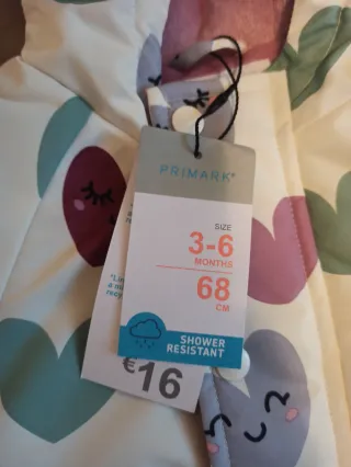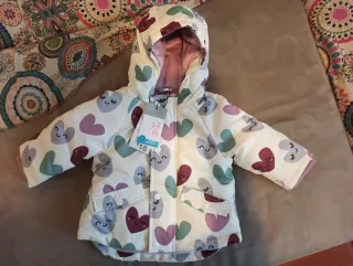 Giacca per neonata Primark con fantasia di cuori. Perfetta per la stagione. - Taglia 68 cm (3-6 mesi). - Chiusura con cerniera e bottoni - Cappuccio foderato.
