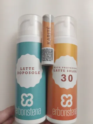 Set di tre prodotti naturali per il sole: 1 latte solare protezione 30, 1 latte dopo sole e 1 burrocacao karité. Prodotti ancora sigillati mai aperti o usati come si vede dalle foto.